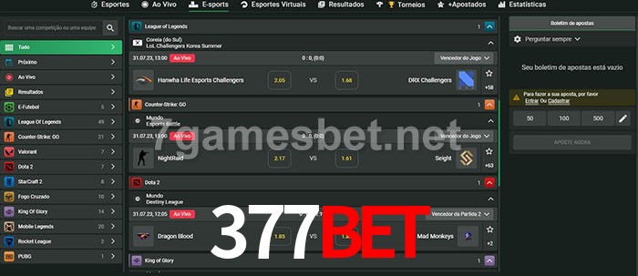 O 377bet oferece uma grande seleção de opções de apostas em e-sports com probabilidades competitivas